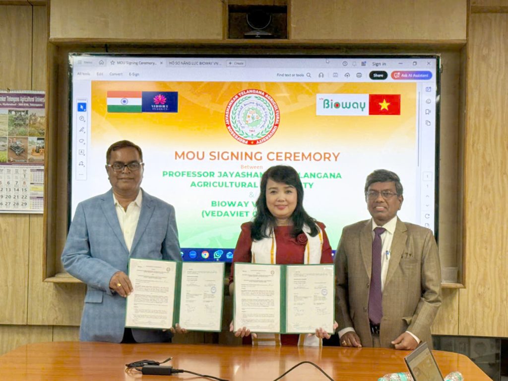 Ngày 14/11/2025, Bioway Việt Nam chính thức ký Biên bản ghi nhớ hợp tác (MOU) với Đại học Nông nghiệp Professor Jayashankar Bang Telangana (PJTAU), Ấn Độ, dưới sự chứng kiến của ông Trần Thanh Tùng – Tham tán Đại sứ quán Việt Nam tại Ấn Độ. Toàn cảnh ký kết MOU với sự chứng…